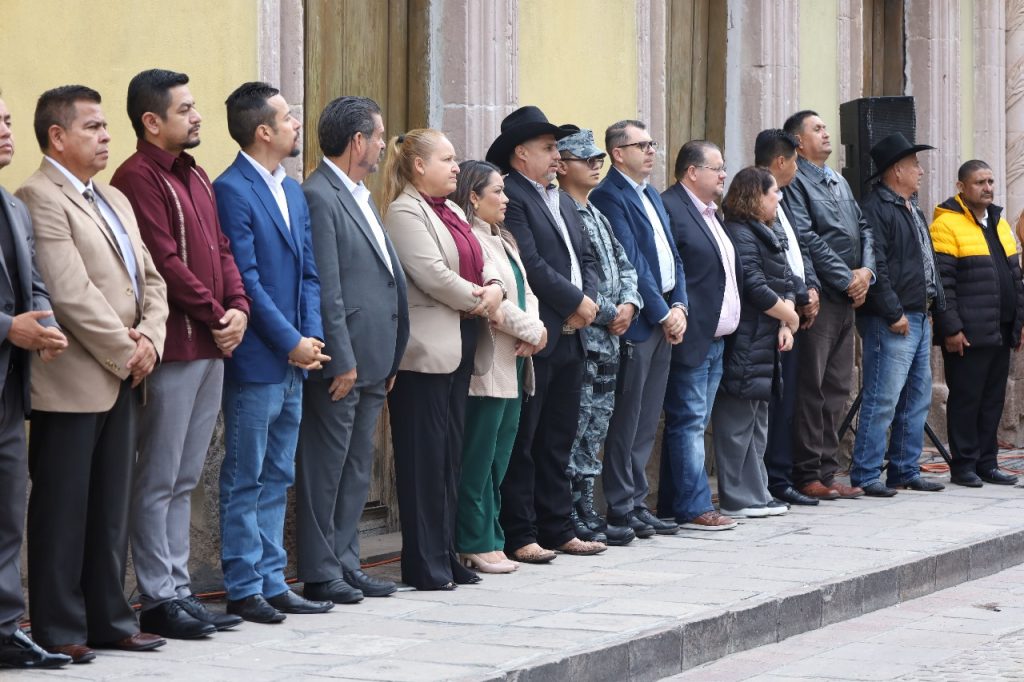 Acompañado por la presidenta honorífica del DIF, Estefana Casas González, así como por autoridades municipales, educativas, de la Guardia Nacional y ciudadanos, el alcalde presidió los honores a la Bandera con la participación de la Secundaria Ramón López Velarde, en un gesto de respeto y unidad hacia los símbolos patrios que nos identifican como mexicanos. Posteriormente, frente al busto del máximo líder del movimiento independentista, Miguel Hidalgo y Costilla, se llevó a cabo la ofrenda floral y la guardia de honor.