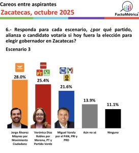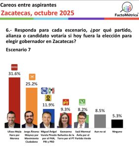 EN EL ESCENARIO SEIS que plantea la encuestadora, ya con posibles candidatos de todos los partidos y alianzas, las preferencias de los encuestados favorecen a ULISES MEJÍA, de Morena, con 31.6%; JORGE ÁLVAREZ, de MC, 25.2%; MIGUEL VARELA de la alianza PRI-PAN-PRD, 11.9%; GEOVANNA BAÑUELOS, del PT, 9.3%; y SAÚL MONREAL 8.2% como candidato del Partido Verde.