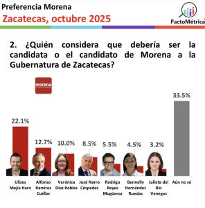 MUY ACTUALIZADA, la empresa FactoMétrica sacó al senador SAÚL MONREAL del grupo de posibles en Morena para la sucesión de DAVID MONREAL en 2027. Pero lo colocó con la camiseta del Partido Verde y omitió referencia al diputado CARLOS PUENTE que la semana pasada se autodestapó en el teatro Calderón. Otro movimiento interesante de la encuestadora fue la inclusión de NORMA JULIETA DEL RÍO en el batallón de suspirantes a la gubernatura de Zacatecas. Y a la ex comisionada del INAI no le va nada mal tomando en cuenta que sus actos de promoción, en Zacatecas, se han reducido a la presentación de su libro sobre transparencia en la capital y en Nochistlán. También debe destacarse que en sus mediciones Facto Métrica propone a JORGE ÁLVAREZ MÁYNEZ como posible candidato de Movimiento Ciudadano pese a que el propio JORGE aclaró oficialmente que no estará en la batalla del 2027 porque le interesa más conducir el proyecto nacional de la naranja mecánica.
