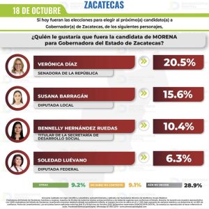 A MEDIADOS DE SEMANA, los operadores políticos de la senadora VERÓNICA DÍAZ difundieron una supuesta encuesta de la empresa Demoscopía Digital. “¿Quién le gustaría que fuera la candidata de Morena para gobernadora…? preguntó por teléfono a 1,000 zacatecanos, del millón 600 mil que viven en el estado, la inmensa mayoría de ellos sin acceso al teléfono. A favor de VERÓNICA DÍAZ respondieron 200; otros 150 apoyaron a SUSANA BARRAGÁN; 100 prefirieron a BENNELLY HERNÁNDEZ y 60 quisieran ver a SOLEDAD LUÉVANO en Palacio de Gobierno.