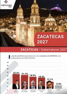 OPERADORES POLÍTICOS de la senadora VERÓNICA DÍAZ presumieron ayer los resultados de una proyección realizada por La Encuesta.Mx sobre las elecciones en Zacatecas en 2027. “¡Es tiempo de mujeres en un mundo de hombres!”, consignaron. Pero en la medición de posibles candidatos de Morena el mejor posicionado fue el senador SAÚL MONREAL, seguido por VERÓNICA DÍAZ y en tercer lugar JOSÉ NARRO. El cuarto sitio lo ocupó ULISES MEJÍA y el quinto y último RODRIGO REYES MUGÜERZA. Por partidos políticos, Morena saca una grande ventaja al PRI y al PAN y supera por 25 puntos a Movimiento Ciudadano. Verde y PT andan por la calle de la amargura. Lo destacaba en las preferencias por partidos es que PAN y PRI, juntos, superan por más de tres puntos a Morena. Y si se suma MC la ventaja sería inalcanzable.