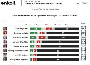 MUCHO ENTUSIASMO generó entre los simpatizantes de ULISES MEJÍA la encuesta de la empresa ENKOLL que publicó El Universal. Y es que el diputado federal, en ausencia de SAÚL MONREAL, acaparó todos los primeros lugares. Empero, advierten expertos, el hijo predilecto de El Remolino no puede echar las campanas al vuelo. La encuesta se levantó con 1,200 entrevistas, población que representa .07 por ciento del total de zacatecanos y zacatecanas. De cada 100 encuestados, 50 no conocen a ULISES. Y sólo 23 tienen buena opinión de él, los otros 27 van de regular a mala. VERÓNICA DÍAZ, la preferida del gobernador DAVID MONREAL, está peor. De cada 100 zacatecanos, 76 nunca han oido hablar de ella ni saben que pitos toca en la política. Y de los 24 que la conocen, sólo 9 dicen que es buena persona, los otros 15 tienen opinión de regular a mala. Y el favorito de RICARDO MONREAL, el ínclito joven secretario de Gobierno, RODRIGO REYES, también tiene mucho trabajo que hacer si quiere ser candidato ganador a la gubernatura. De cada 100 encuestados, 85 no lo han visto ni a él ni a sus lentes ni a su publicidad doble RR. Y de los 15 que lo identifican, solo 4 dicen que es muy chido y a todo mecate. Los otros 11 lo ven muy ovalado para huevo y muy redondo para aguacate.