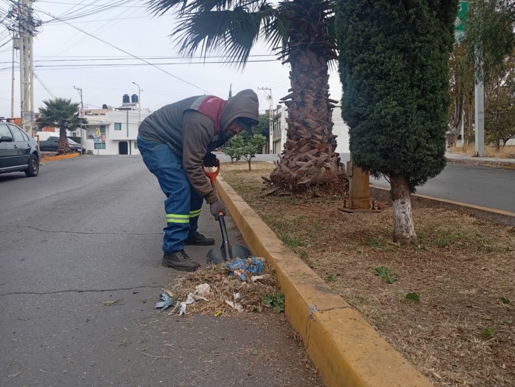 En la avenida Miguel Cabrera, en la colonia Villas de Guadalupe, se intervinieron camellones centrales y laterales, banquetas y áreas aledañas, realizando desmalezado, retiro de tierra, barrido fino y poda de 57 árboles, atendiendo una superficie de 1 mil 800 metros cuadrados.