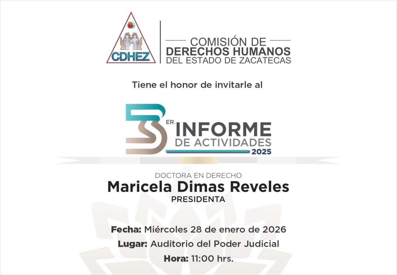 La Dra. Maricela Dimas Reveles, Presidenta de la Comisión de Derechos Humanos del Estado de Zacatecas (CDHEZ) presentó su Tercer Informe de Actividades correspondiente al año 2025 al frente al Organismo, como un ejercicio de rendición de cuentas, transparencia y diálogo democrático, mediante el cual se dio cuenta de los avances, retos y resultados alcanzados en la defensa, protección y promoción de los derechos humanos en la entidad.