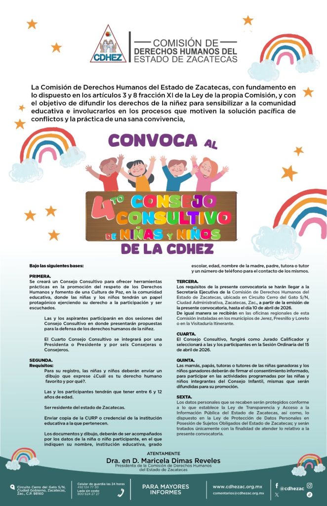 La Comisión de Derechos Humanos del Estado de Zacatecas (CDHEZ) emitió la convocatoria para integrar el Cuarto Consejo Consultivo Infantil de Niñas y Niños, un espacio de participación que fortalece el ejercicio del derecho de la niñez a opinar, proponer y ser escuchada en la promoción y defensa de los derechos humanos.