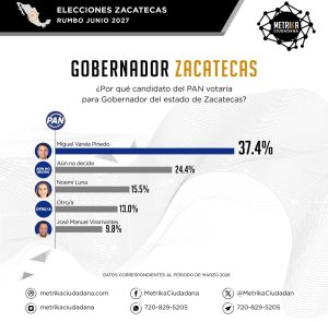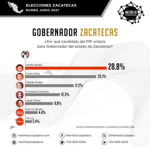 FITO BONILLA se mantiene como el preferido de las multitudes para ser el candidato del PRI a la gubernatura de Zacatecas en 2027. Sin embargo, de tanto ir y venir por todo el estado y de tanto entrarle a los fregadazos con el gobierno de DAVID MONREAL, CARLOS PEÑA ya tiene a tiro de piedra al hijo consentido de don PEPE BONILLA. La encuestadora Métrika Ciudadana reveló los resultados de sus mediciones de marzo y se aprecia que en la pista del Revolucionario, FITO y PEÑA corren en la delantera, ya alejados de los demás aspirantes, con una diferencia de apenas tres puntos. La intención de voto en el bloque priista queda: FITO BONILLA, 28.8%; CARLOS PEÑA 25.1%; CLAUDIA ANAYA 17.2%; FUENSANTA GUERRERO 12.3%; y JAVIER TORRES, el alcalde de Fresnillo del hermano incómodo, 9.8 por ciento.