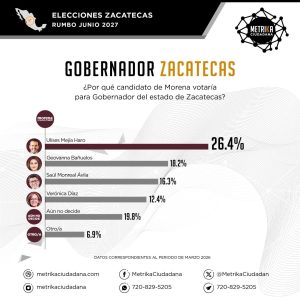 EN MORENA la encuestadora incluyó en su medición a SAÚL MONREAL y a la senadora del PT, GEOVANNA BAÑUELOS. La composición del grupo no tiene mucha lógica, pero como toda las demás encuestas el primer lugar lo ocupa ULISES MEJÍA HARO con 26.4% de las preferencias, seguido por GEOVANNA BAÑUELOS con 18.2%; en tercer lugar, con 16.3% aparece SAÚL MONREAL y en la cola, con 12.4% de intención de voto, la senadora VERÓNICA DÍAZ. Métrika deja fuera a JOSÉ NARRO, CARLOS PUENTE, ALFONSO RAMÍREZ CUÉLLAR y a BENELLY HERNÁNDEZ RUEDA.