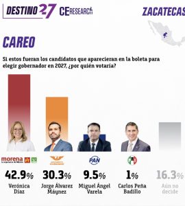 EN ENCUESTAS QUE —acusan sus adversarios— realizan “empresas patito”, la senadora VERÓNICA DÍAZ aparece poderosa y con márgenes de ventaja que se antojan inalcanzables. Ayer se difundió en las redes sociales la medición Destino 27 de la firma CEresearch. En todas las reacciones, “atributos” los llama la encuestadora, VERÓNICA aparece en primer lugar. Y en el careo contra posibles candidatos de otros partidos y alianzas también lleva la delantera. “Si estos fueran loas candidatos que aparecieran en la boleta para elegir gobernador en 2027 ¿Por quién votaría? Plantea la pregunta. El resultado fue: VERÓNICA DÍAZ, de Morena-PT-Verde, 42.9%; JORGE ÁLVAREZ MÁYNEZ, de MC, 30.3%; MIGUEL ÁNGEL VARELA, PAN, 9.5%; y CARLOS PEÑA BADILLO, PRI, 1%. En las mediciones internas CEresearch no incluye a CARLOS PUENTE, SAÚL MONREAL y ALFONSO RAMÍREZ CUÉLLAR.